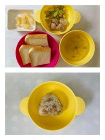 ⚪︎食パン・鶏肉のマーマレード煮・人参とコーンのソテー・コンソメスープ・バナナ